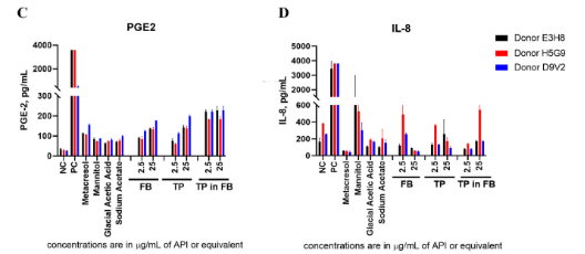 针对客户制剂缓冲液(TP)处理组出现的PGE-2和IL-8升高现象,澳能通过严谨的平行对照实验设计(TP与FB独立稀释至等效浓度,辅以TP/FB稀释组及稀释液对照组),精准区分诱因源。最终数据明确显示:该细胞因子反应由制剂缓冲液(FB)触发,非API本身所致。