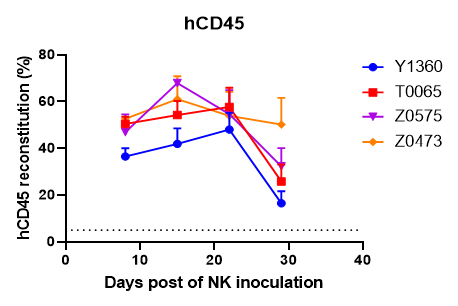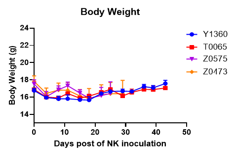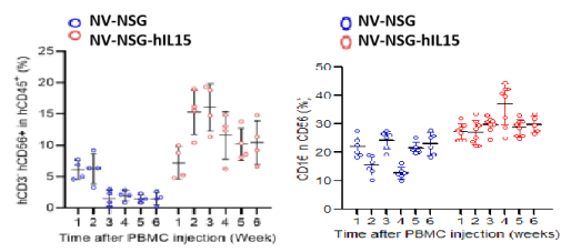 下图显示hlL15模型中,人NK细胞重建期间小鼠体重稳定(四组变化均较小),证明模型可靠性;同时hCD45+细胞在1-2周达重建峰值,第3周后NK细胞逐渐减少。