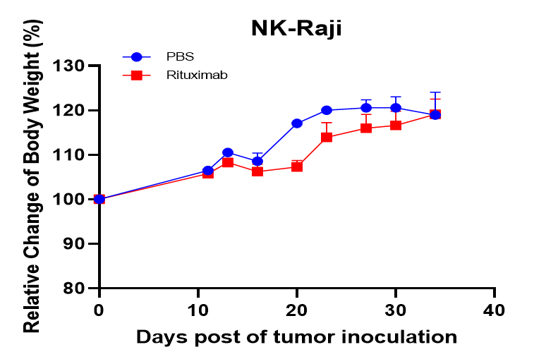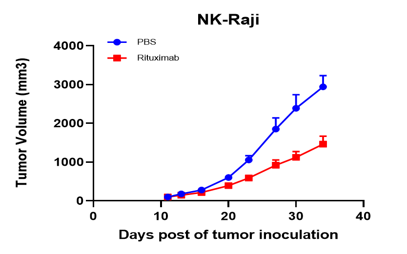在AN-NSG-hIL15小鼠皮下接种Raji淋巴瘤细胞后,利妥昔单抗治疗组较PBS组显著抑制肿瘤生长(TGI=52%)。