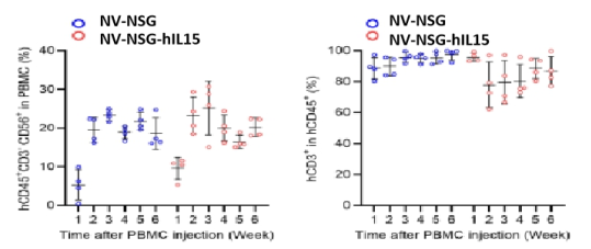 澳能生物基于NVG小鼠模型,敲入人源IL15基因,开发出AN-NSG-hlL15小鼠,可支持人PBMC和NK细胞的定植、增殖及功能重建(存活期>6周),可适用于: