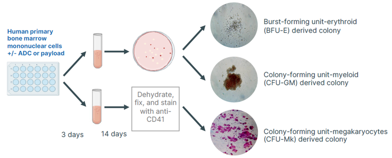 该方法将造血细胞接种于含细胞因子的半固体培养基中,祖细胞增殖分化形成特定类型的成熟血细胞集落(如CFU-E,BFU-E,CFU-G,CFU-M,CFU-GM,CFU-GEMM)。通过分析集落数量、类型和形态,可精准反映ADC及其载荷对造血系统的潜在毒性风险。